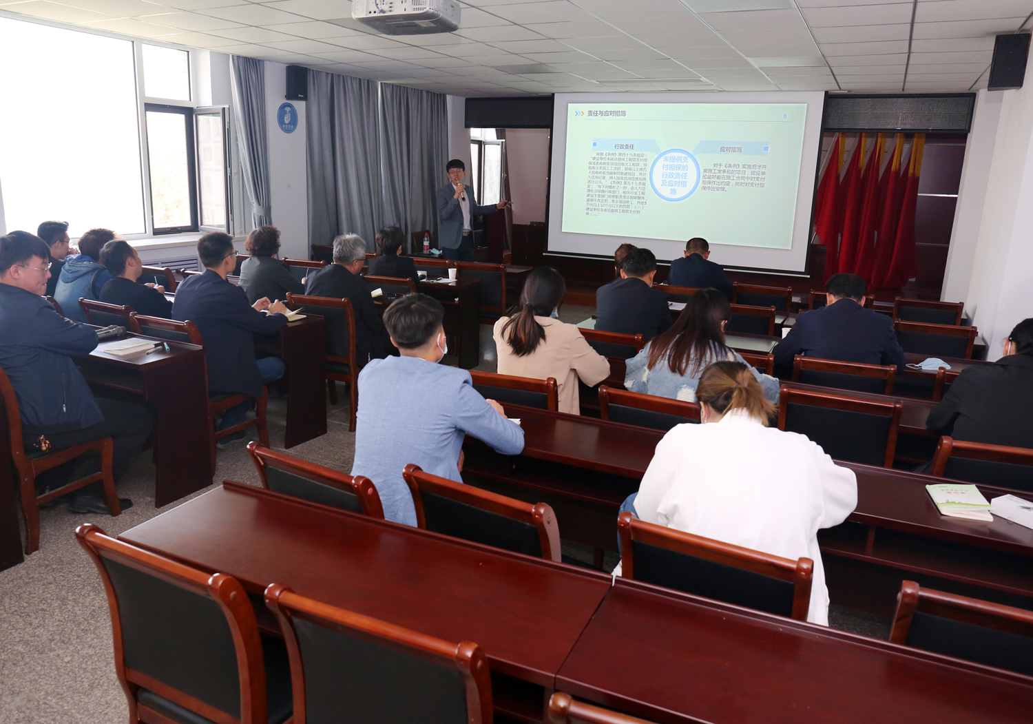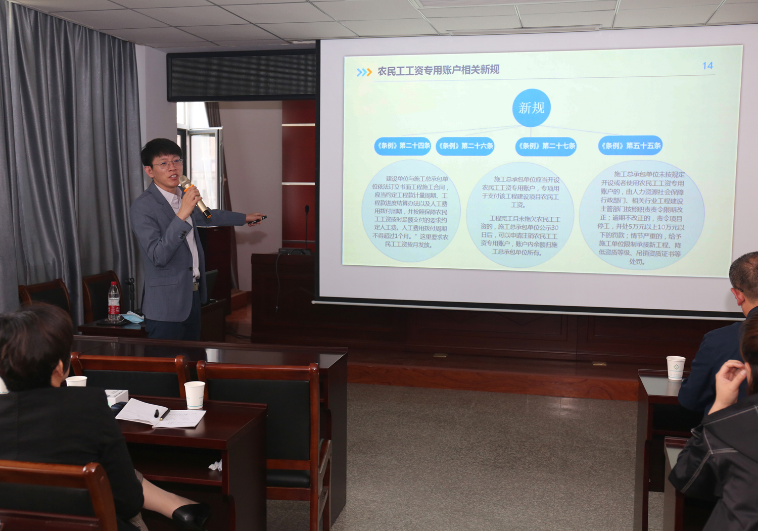 為規(guī)范農(nóng)民工工資支付行為,維護(hù)農(nóng)民工勞動(dòng)報(bào)酬權(quán)益,切實(shí)保護(hù)農(nóng)民工合法權(quán)益,4月24日,我公司特邀請(qǐng)公司法律顧問(wèn)單位山西衡霄律師事務(wù)所楊舟律師對(duì)國(guó)務(wù)院印發(fā)《保障農(nóng)民工工資支付條例》進(jìn)行授課培訓(xùn)。公司董事長(zhǎng)兼總經(jīng)理崔作銘、副總經(jīng)理范永勝、下屬三家單位負(fù)責(zé)人、姚暹渠禹都段項(xiàng)目公司、鴨子池項(xiàng)目公司相關(guān)人員及公司機(jī)關(guān)人員參加培訓(xùn)。